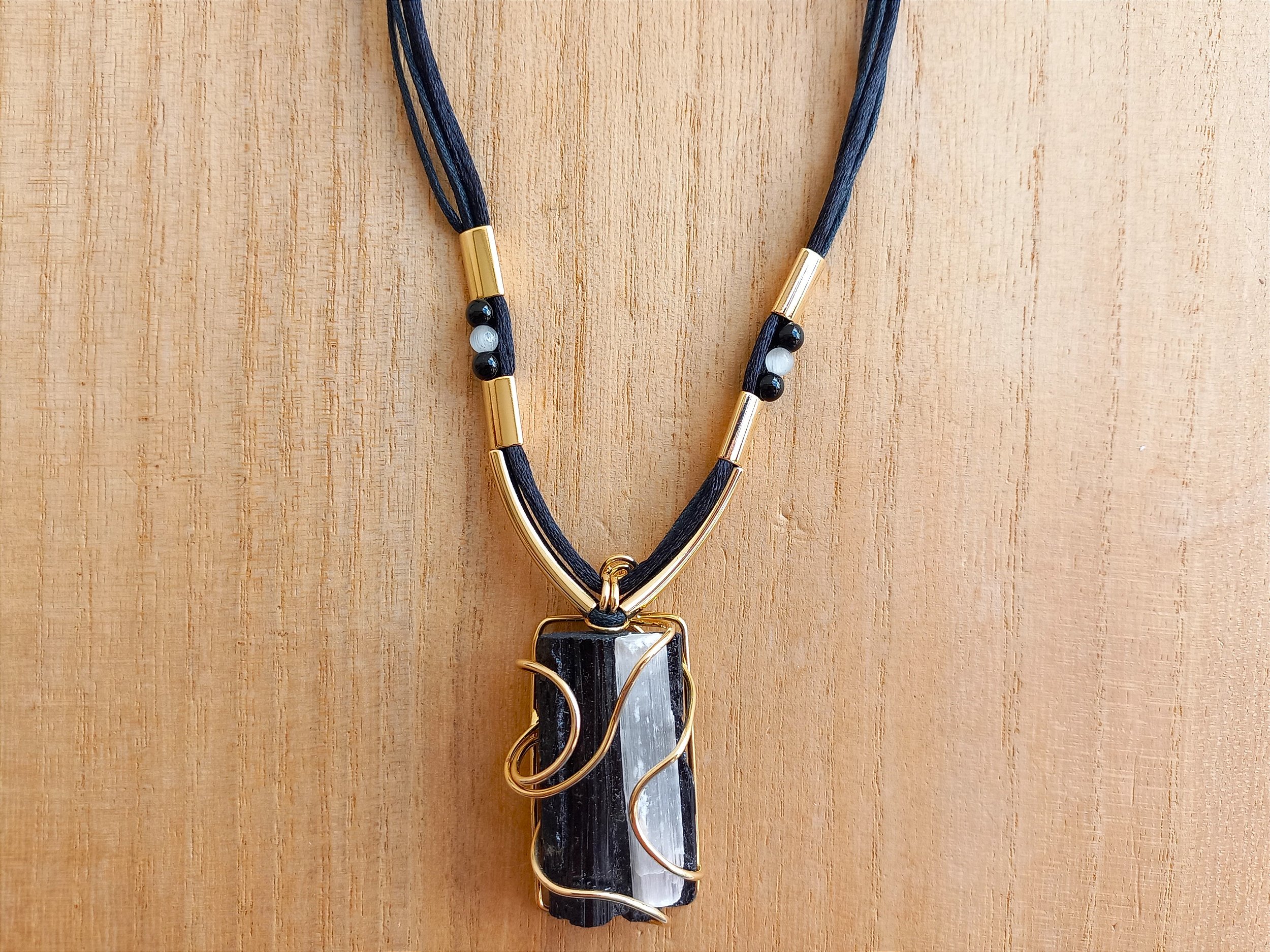 Colar regulável de turmalina negra e selenita