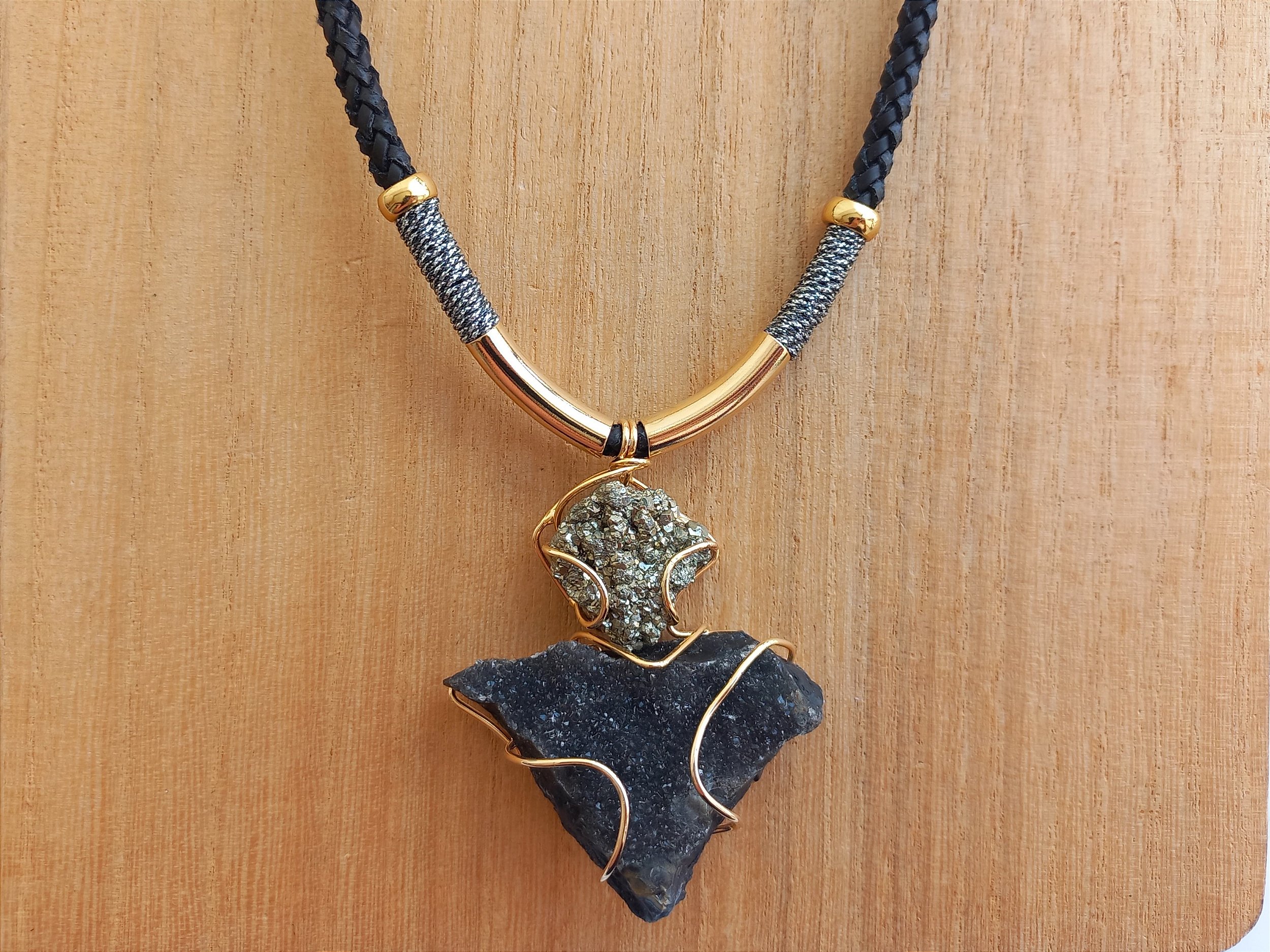 Colar curto um cordão de pirita e calcedônia